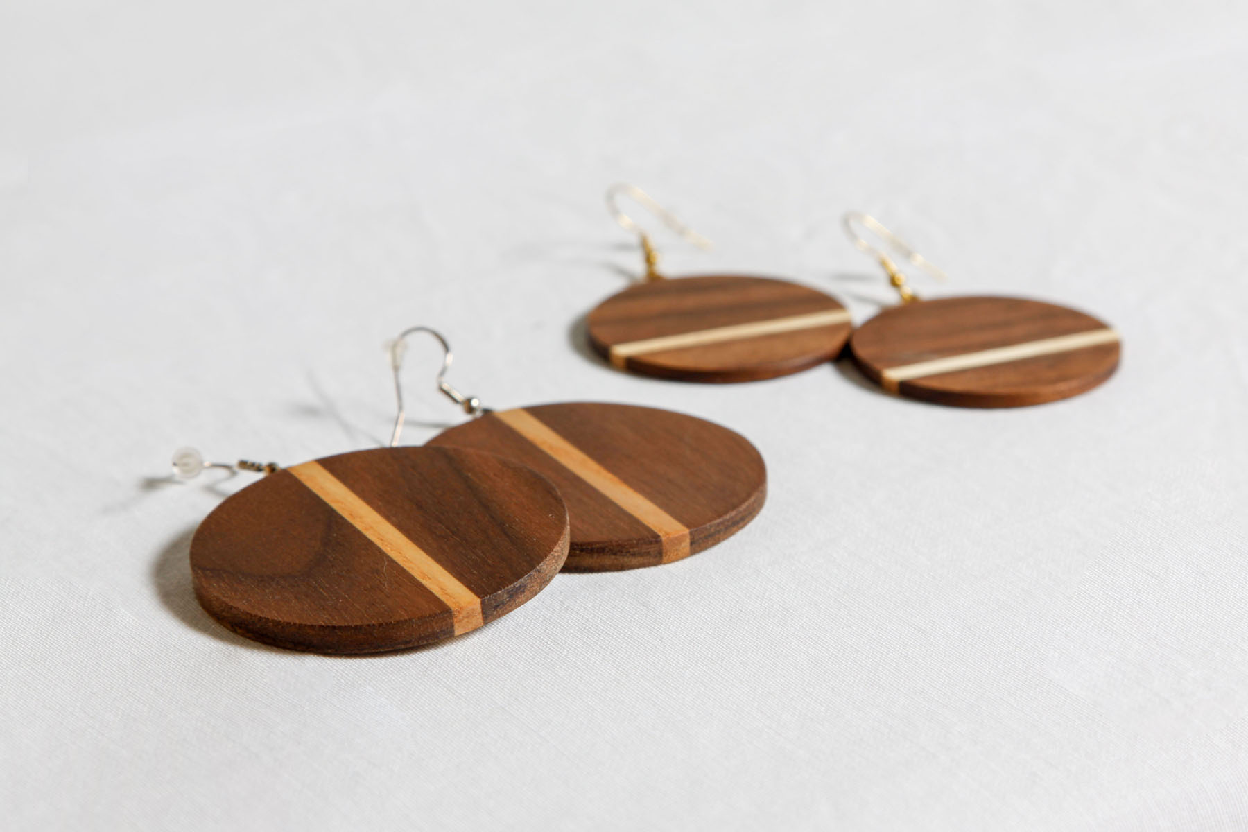 Feine Holzohrringe gefertigt aus Kirsch-, Nussbaum- oder Ahornholz. Die natürliche Maserung macht jedes Paar zu einem echten Unikat.